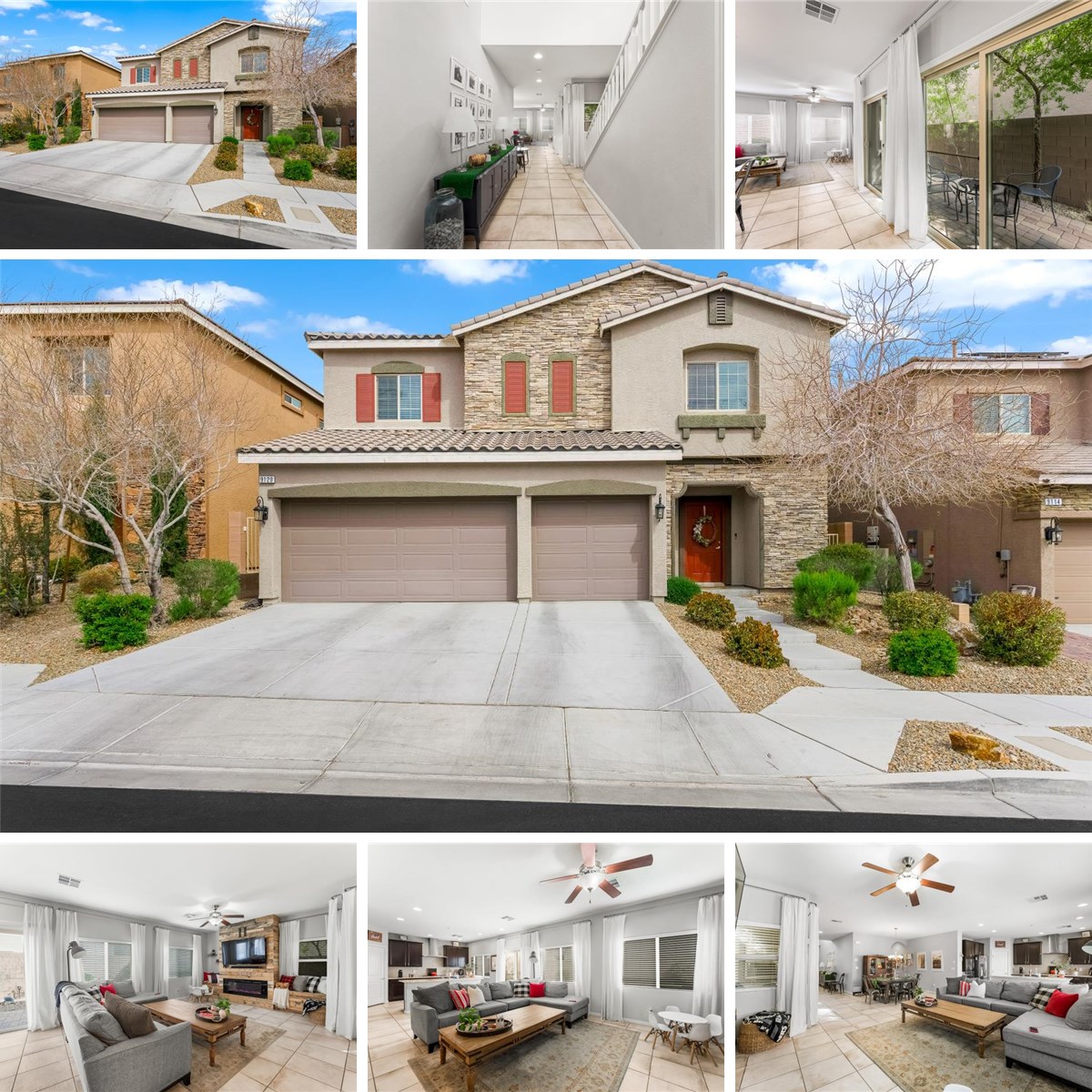 Experience exceptional living in this stunning 2,976-square-foot single-family home, nestled on a 4,791-square-foot lot in a desirable Centennial Hills neighborhood. Built in 2015, this residence offers 5 spacious bedrooms and 3 full bathrooms, blending contemporary style with functional design—perfect for families and entertaining. The thoughtfully designed interior features a modern kitchen equipped with GE stainless steel appliances, granite countertops, a cooktop with range and backsplash, and 42" upper cabinets with crown molding. Elegant tile flooring flows throughout, complementing the home's 9' ceilings on both levels. Ceiling fans enhance comfort, while an oversized 3 car garage and a 22' driveway provide ample parking and storage space. Retreat to the luxurious primary suite, which boasts a double-door entry, a spacious bath with dual sinks, a separate shower, a soaking tub, and a generous walk-in closet. The backyard showcases lush natural grass and pavers.